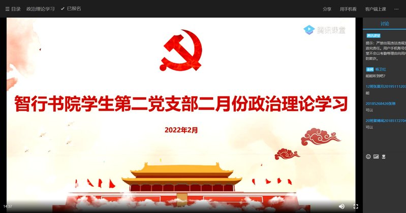 2月25日下午,智行书院学生第二党支部利用腾讯课堂开展二月份政治理论学习会议,全文学习了习近平总书记在省部级主要领导干部学习贯彻党的十九届六中全会精神专题研讨班开班式上发表的重要讲话、习近平总书记在十九届中央纪委六次全会上发表重要讲话、习近平总书记的不断巩固拓展党史学习教育成果 团结带领全国各族人民满怀信心奋进新征程建功新时代等内容。党支部全体党员同志参加,会议由党支部书记杨卫红主持。