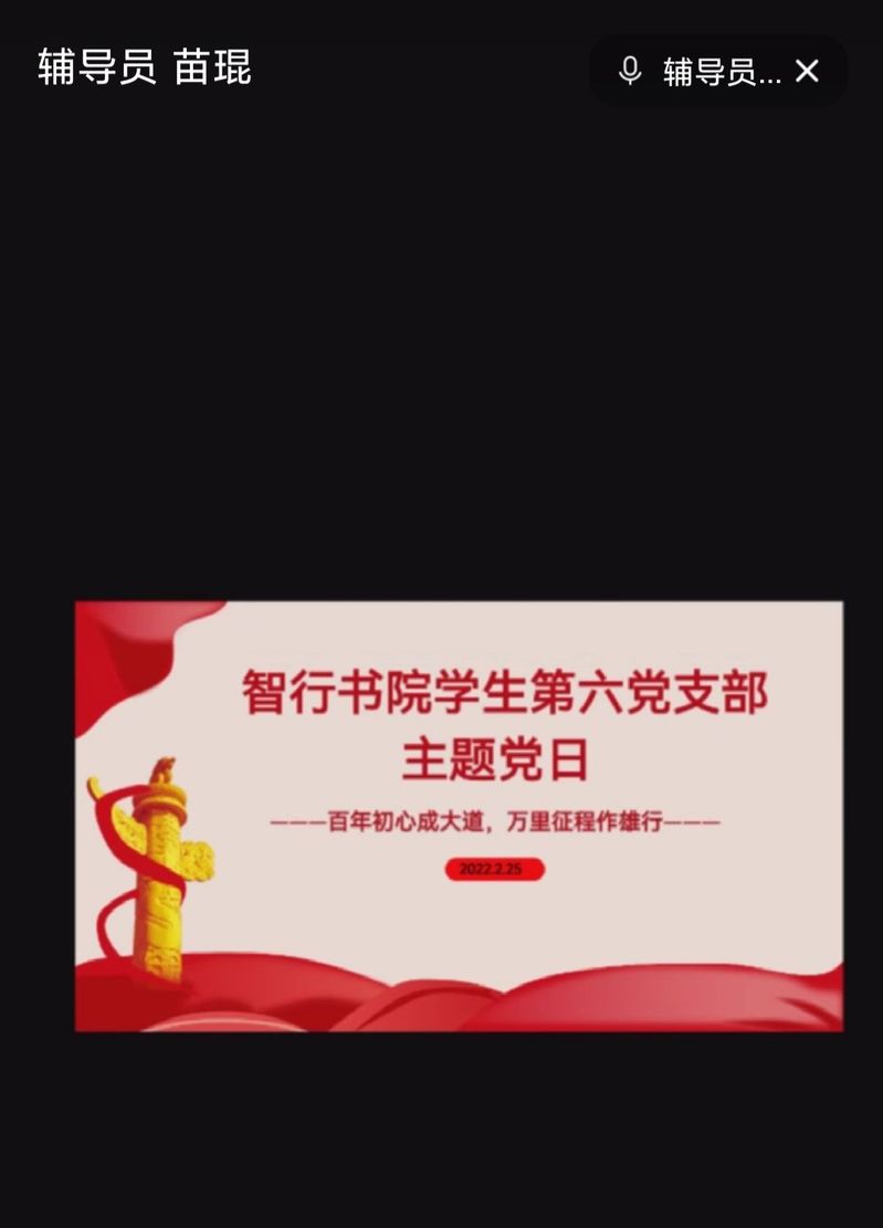 2月25日晚,智行书院学生第六党支部在腾讯会议开展“以史为鉴砺初心,笃行不怠创未来 ”主题党日活动,党支部全体党员同志参加。会议由支部书记苗琨主持。