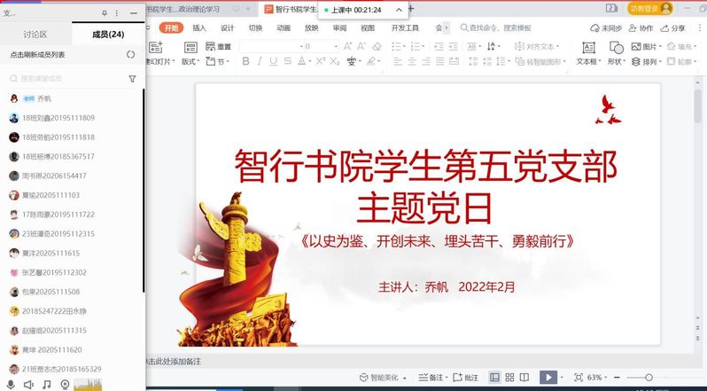 2月22日下午,智行书院学生第五党支部在腾讯会议开展“以史为鉴、开创未来”主题党日活动,会议由党支部书记乔帆主持,全体党员参加。