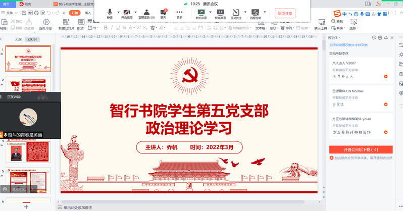3月13日下午,智行书院学生第五党支部于线上召开三月份政治理论学习会议。全文学习了李克强总理在第十三届全国人民代表大会第五次会议中作出的2022年政府工作报告,党支部全体党员同志参加。会议由党支部书记乔帆主持。