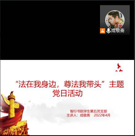 为进一步提升学生的法制意识和法治素养,4月19日,智行书院学生第五党支部于腾讯会议开展四月份“法制宣传教育”主题党日活动。会议由支部书记成敬斋主持,学生第五党支部全体党员参加。