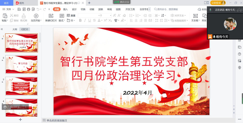 4月16日,智行书院学生第五党支部在腾讯会议线上开展四月份政治理论学习,会议由党支部书记成敬斋主持,智行书院学生第五党支部全体党员参加。