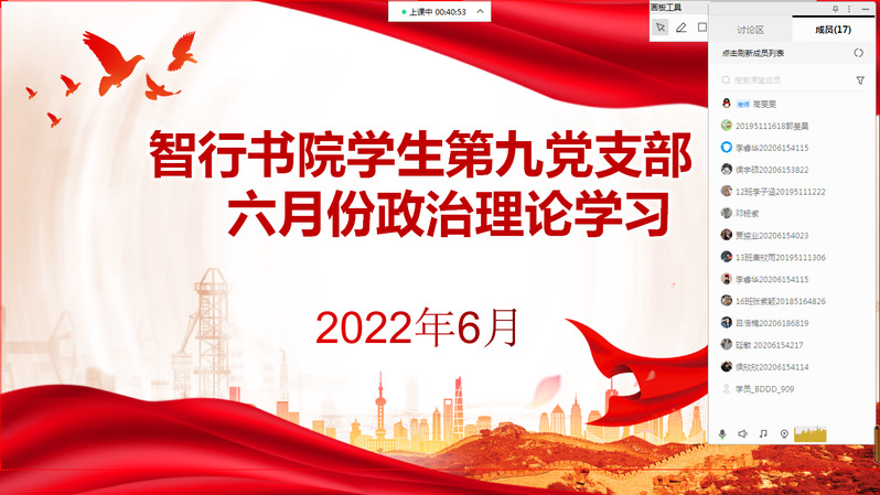 6月15日下午,智行书院第九党支部于线上召开六月份政治理论学习。会议由党支部书记高雯雯主持,第九党支部全体党员参加。