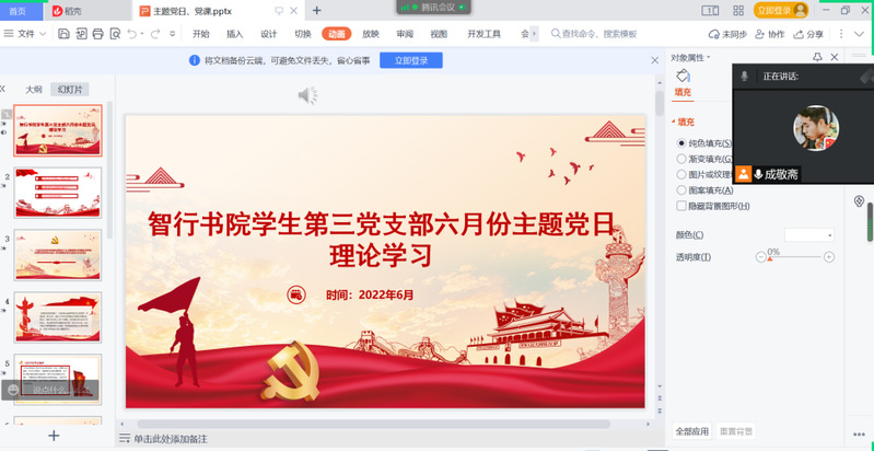 6月17日,智行书院学生第三党支部在腾讯会议开展“迎七一跟党走,我为党旗添光彩”主题党日活动。会议由党支部书记成敬斋主持,党支部全体党员参加。