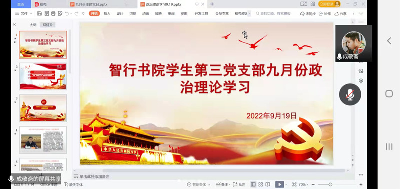 9月19日,学生第三党支部在腾讯会议召开九月份政治理论学习。会议由党支部书记成敬斋主持,学生第三党支部全体党员参加。