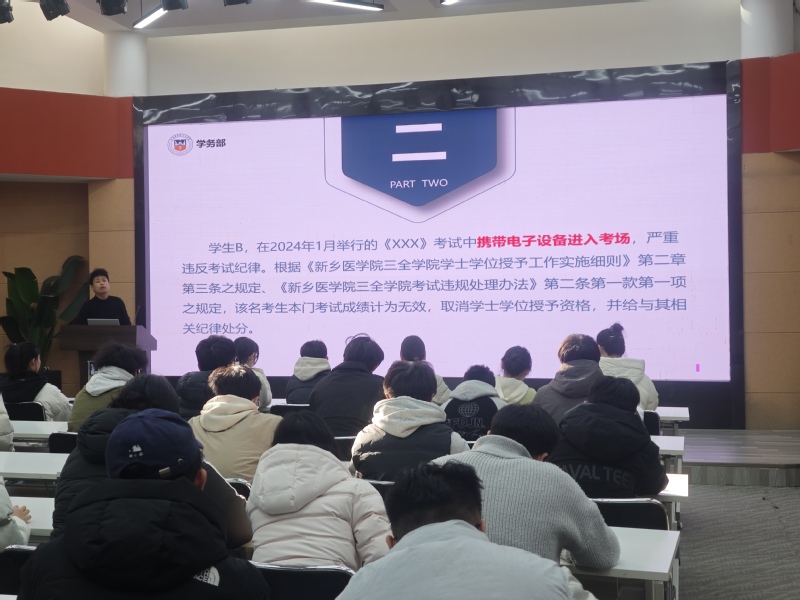 为强化学生不触考风红线、坚守诚信底线思维,书院组织全体辅导员召开“文明修身诚信笃行”主题教育班会,班会上,针对即将到来的四六级、考研以及期末考试,辅导员老师专门聚焦考试诚信展开专题教育引导,并围绕《中华人民共和国教育法》和《国家教育考试违规处理办法》有关作弊违法犯罪的法律条款,进行警示教育宣讲,告知学生要严守考试纪律,使每一名学生都充分认识到参与作弊、助考、替考等违法违规行为所带来的严重法律后果,切实做到知法守法。在互动研讨环节,师生们共同探讨“如何坚守学术诚信”“医学生如何践行诚信”“四六级考试中如何做到诚信应考”等话题,提出“拒绝作弊造假、诚信应对考试” 的行动倡议。”