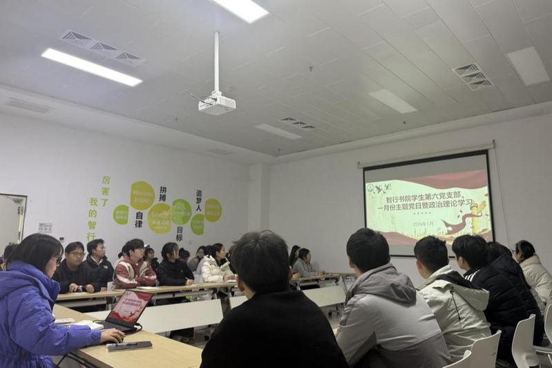 正值2026年新年开局之际,为筑牢党支部成员思想根基,推动党的创新理论入脑入心,1月15日下午,智行书院学生第六党支部于智苑多功能会议室开展一月份主题党日活动暨政治理论学习。活动由党支部书记张永艳主持,党支部全体成员参加。
